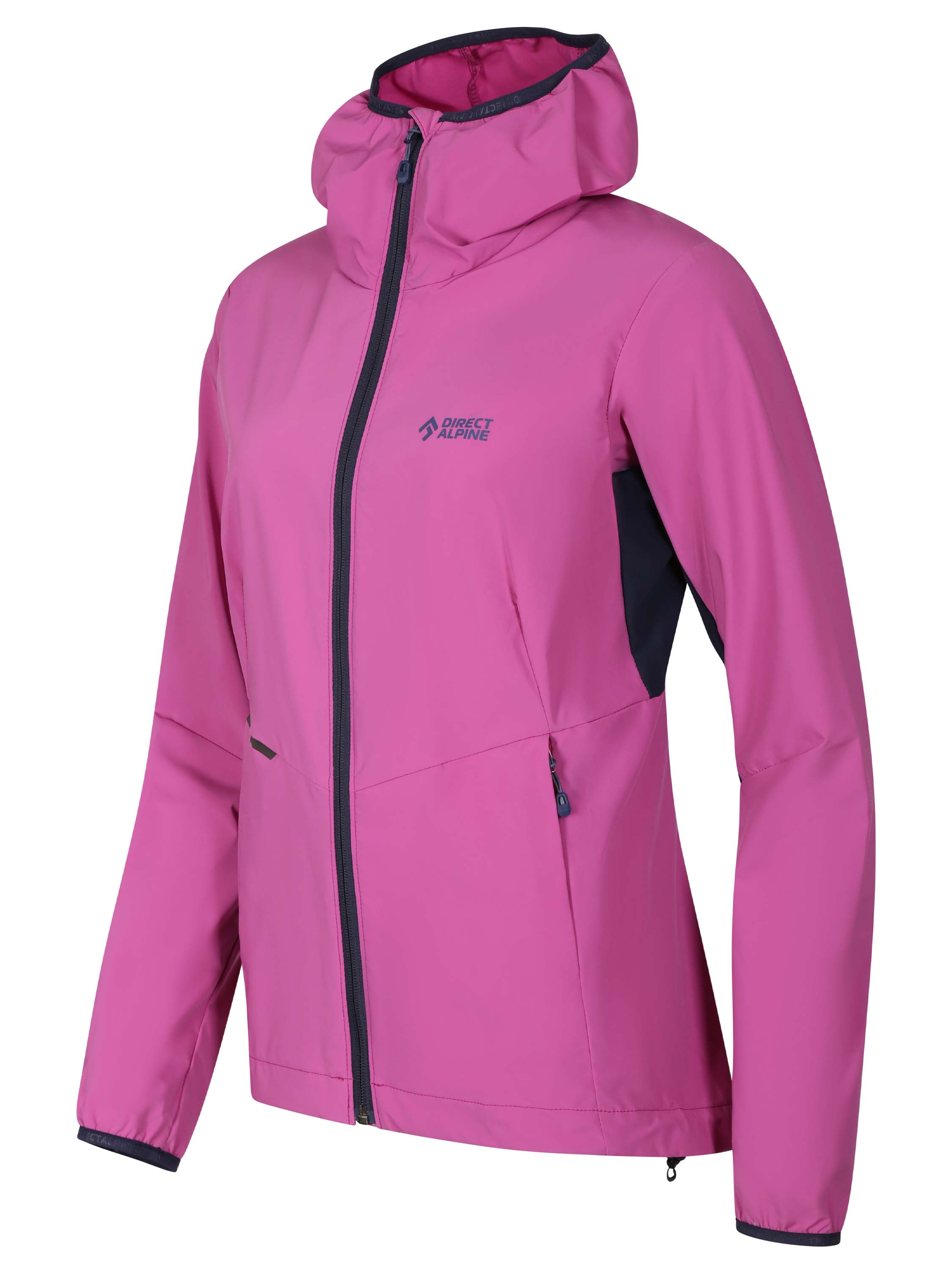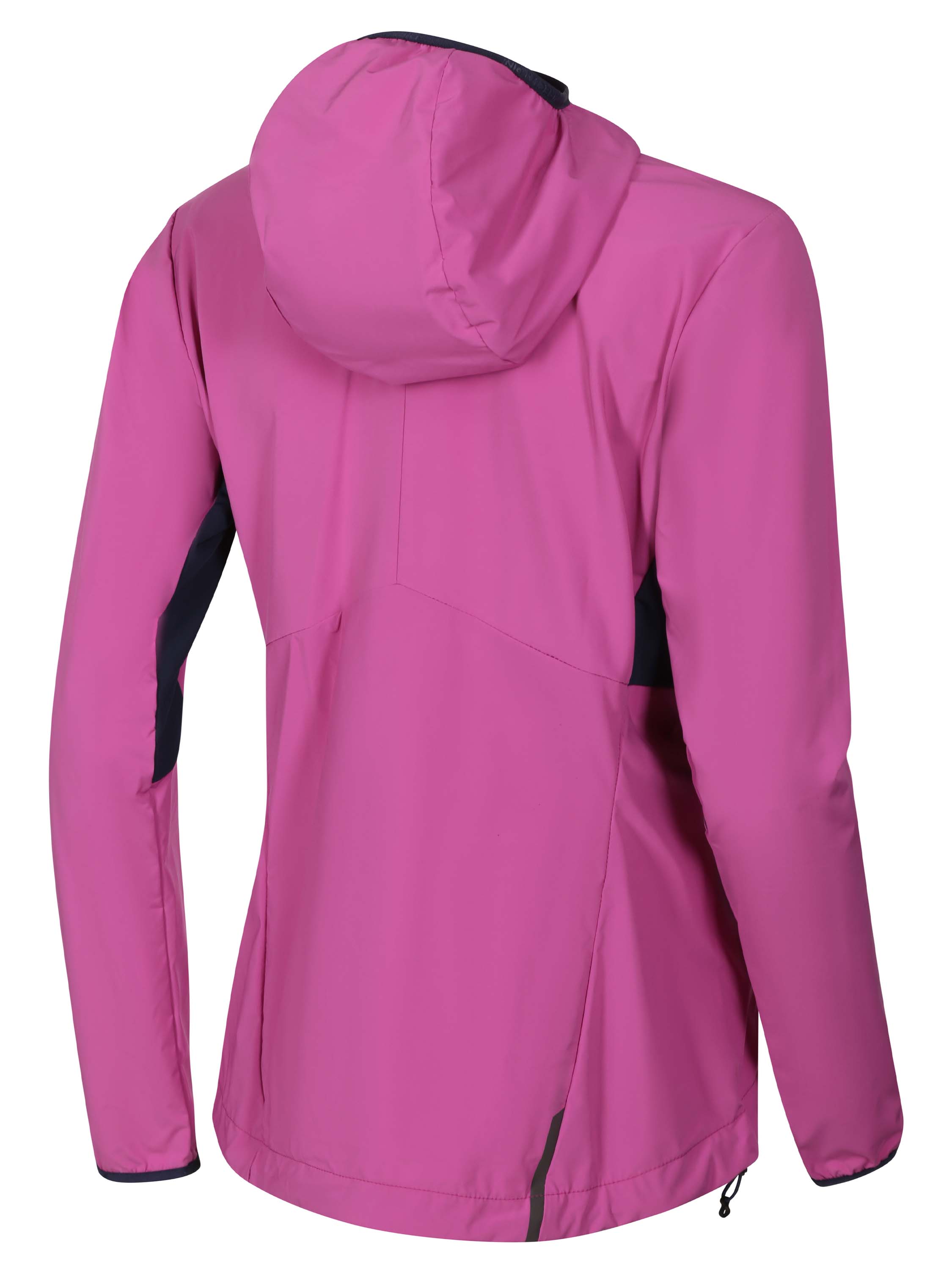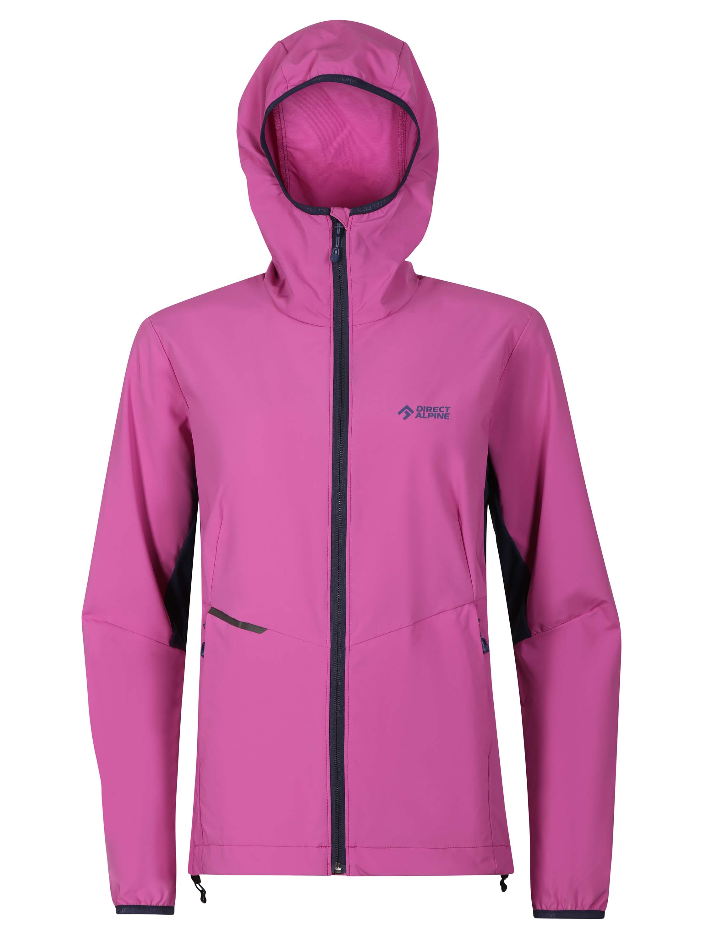The anatomically designed cut extended back panel, and one-handed hem adjustment allow for unrestricted movement during climbing, alpine activities, or hiking. The jacket features two front zippered pockets for your essentials. Colorful reflective elements ensure better visibility and safety on trails. The hood is designed for women who wear a ponytail.