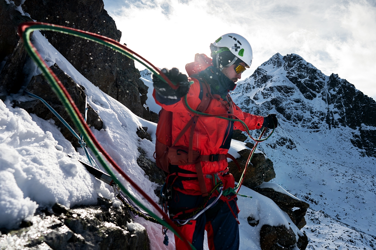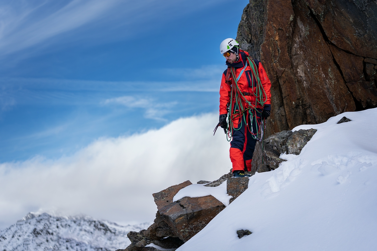 The GUIDE jacket features a thoughtfully designed pocket system. There is a large bellows pocket at the front for gloves, straps, or goggles, an internal zip pocket for valuables, and an additional sleeve pocket with a Recco® signal reflector.
