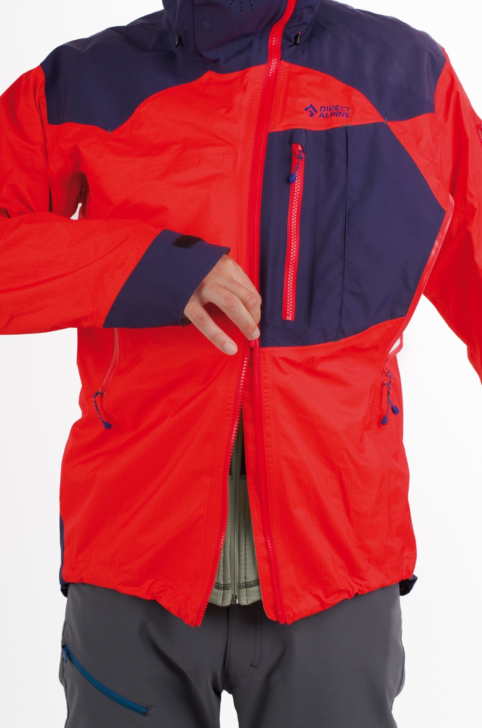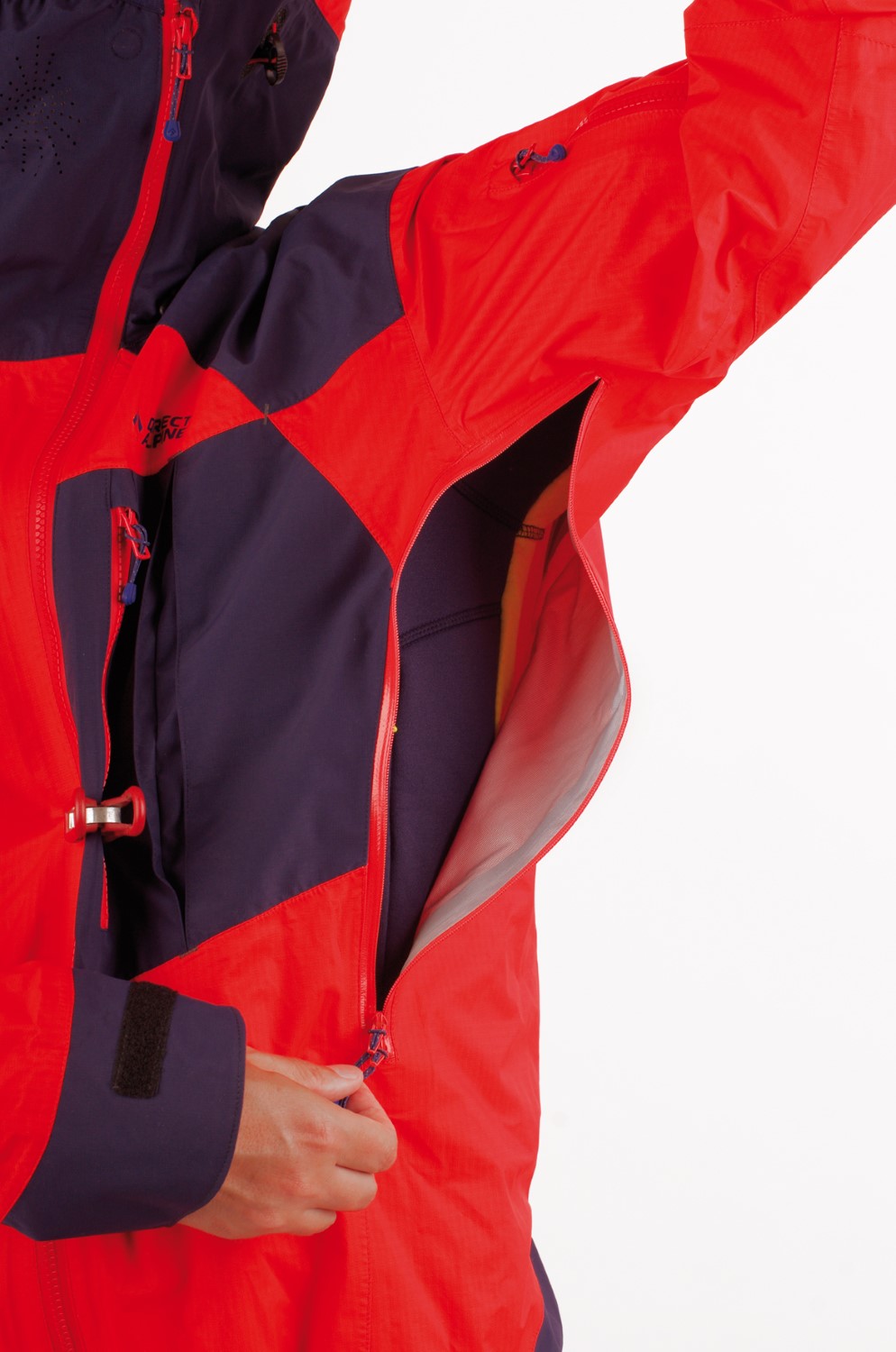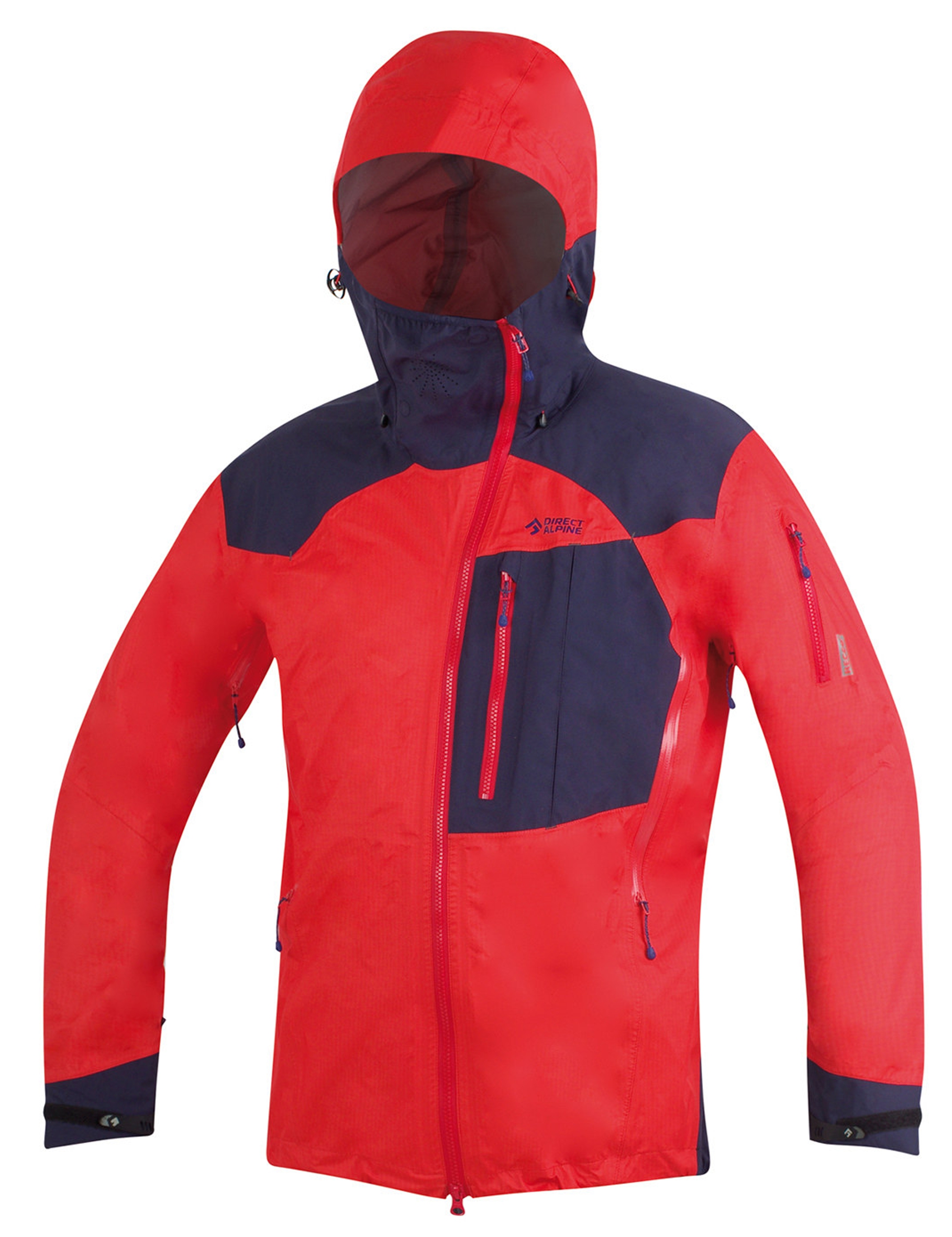 The outdoor jacket includes a large, well-designed hood with three-way adjustment, which can be pulled over a helmet. The hood also serves as a means to pack the jacket into your backpack. Long ventilation zippers on the sides are accessible even with backpack straps and are designed to allow access to inner layer pockets. By combining a sturdier fabric in high-stress areas (shoulders, sleeves, hood, and back) with a thinner fabric in less stressed areas, the jacket achieves an optimized balance of durability, extreme breathability, and weight.