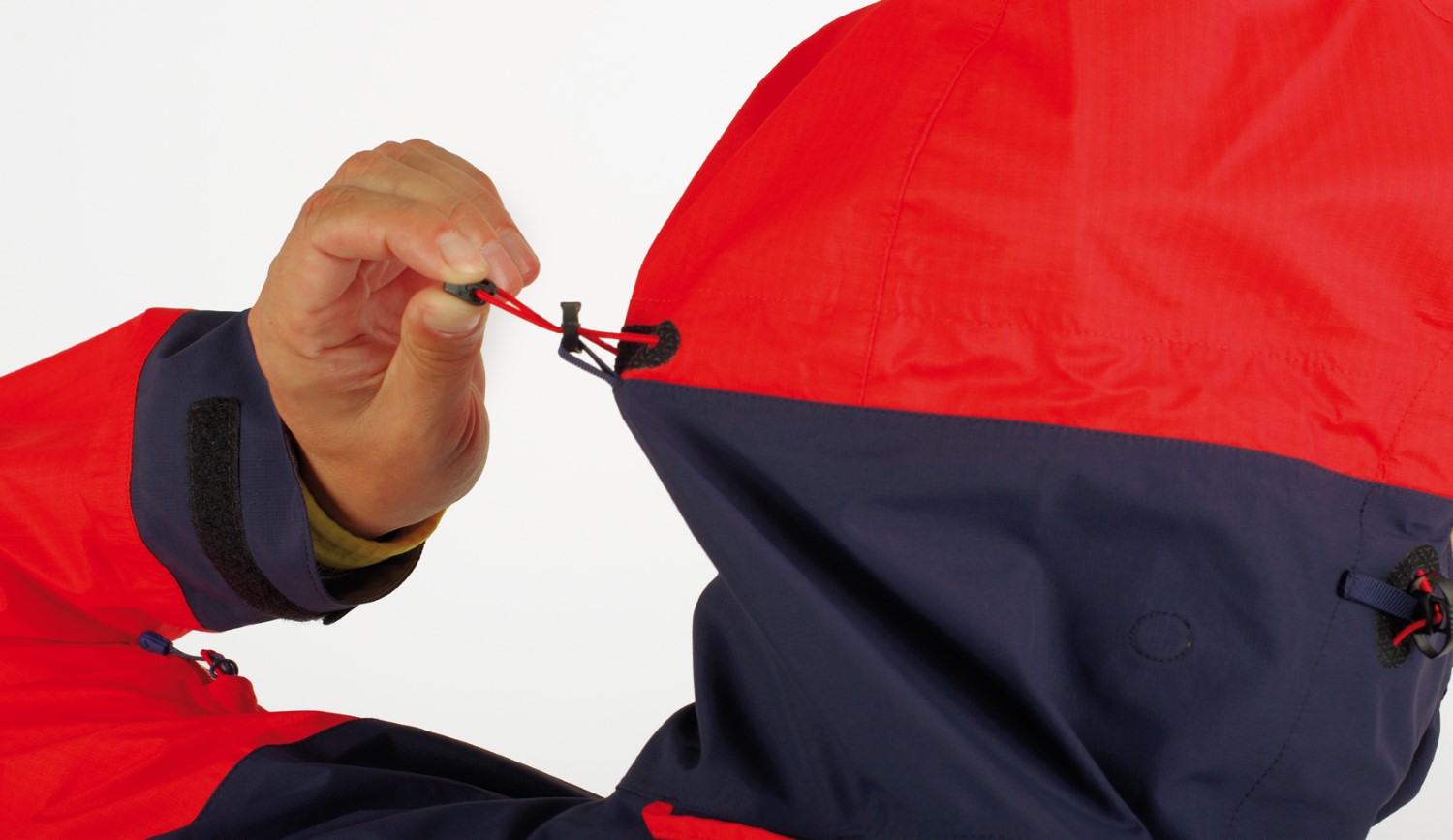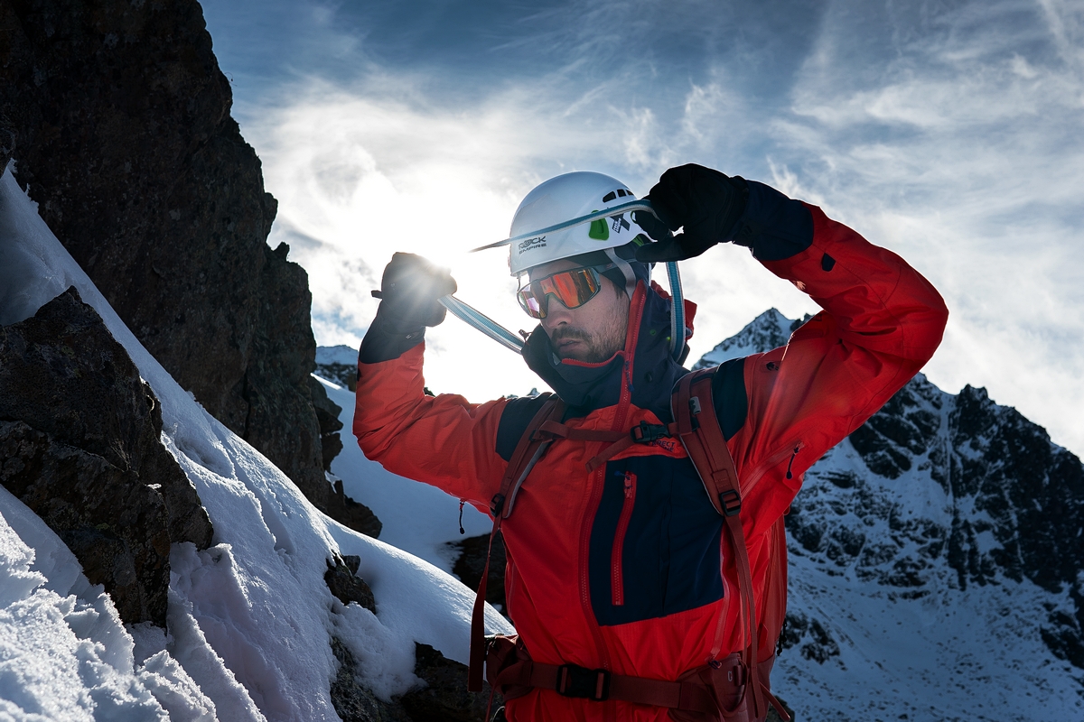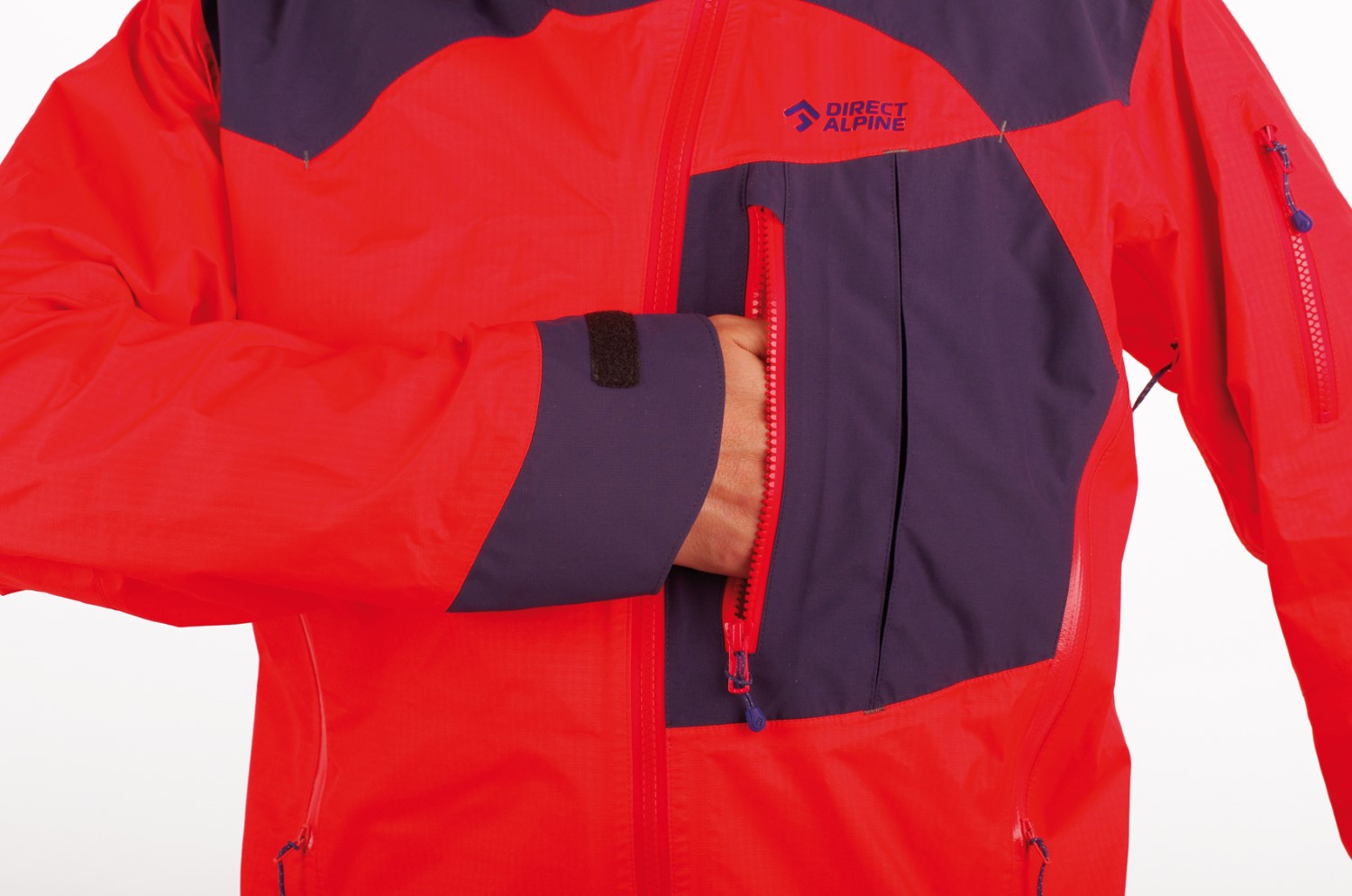 The outdoor jacket includes a large, well-designed hood with three-way adjustment, which can be pulled over a helmet. The hood also serves as a means to pack the jacket into your backpack. Long ventilation zippers on the sides are accessible even with backpack straps and are designed to allow access to inner layer pockets. By combining a sturdier fabric in high-stress areas (shoulders, sleeves, hood, and back) with a thinner fabric in less stressed areas, the jacket achieves an optimized balance of durability, extreme breathability, and weight.