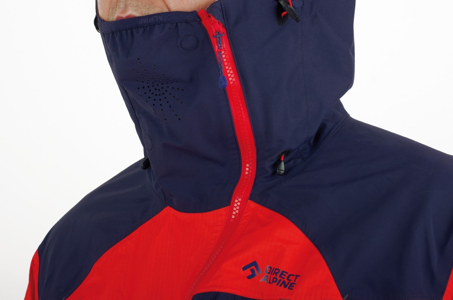 The GUIDE Men's Hardshell Jacket features a slanted central zipper with two-way zippers and a high collar that covers the face and nose, preventing wind, rain, or snow from penetrating. The inner side of the collar is lined with a soft material to protect the membrane from beard abrasion and enhance comfort when fully zipped. The collar also has breathing holes for easier ventilation when fully zipped.