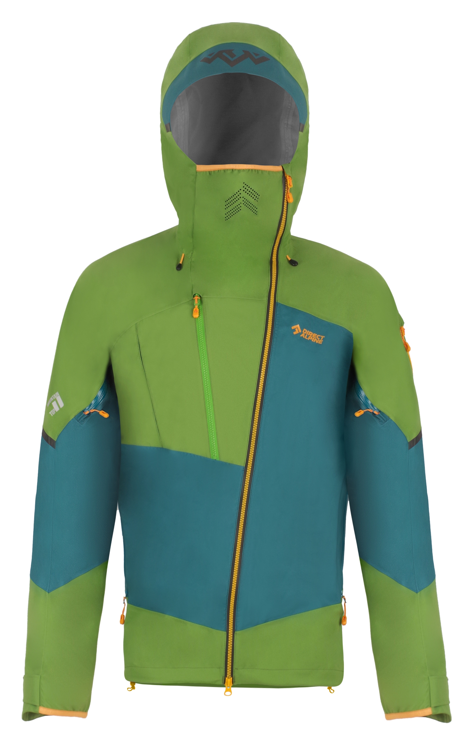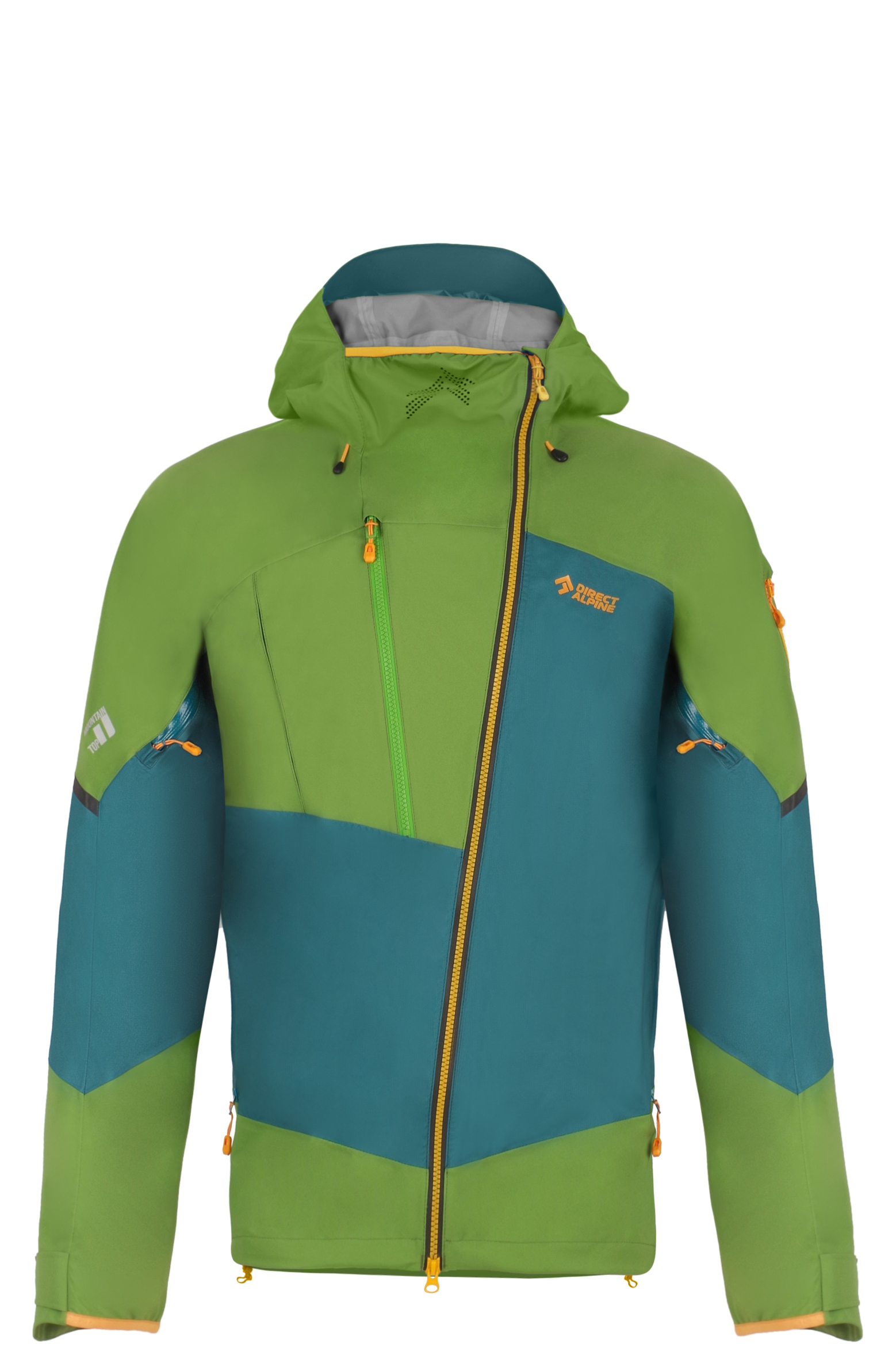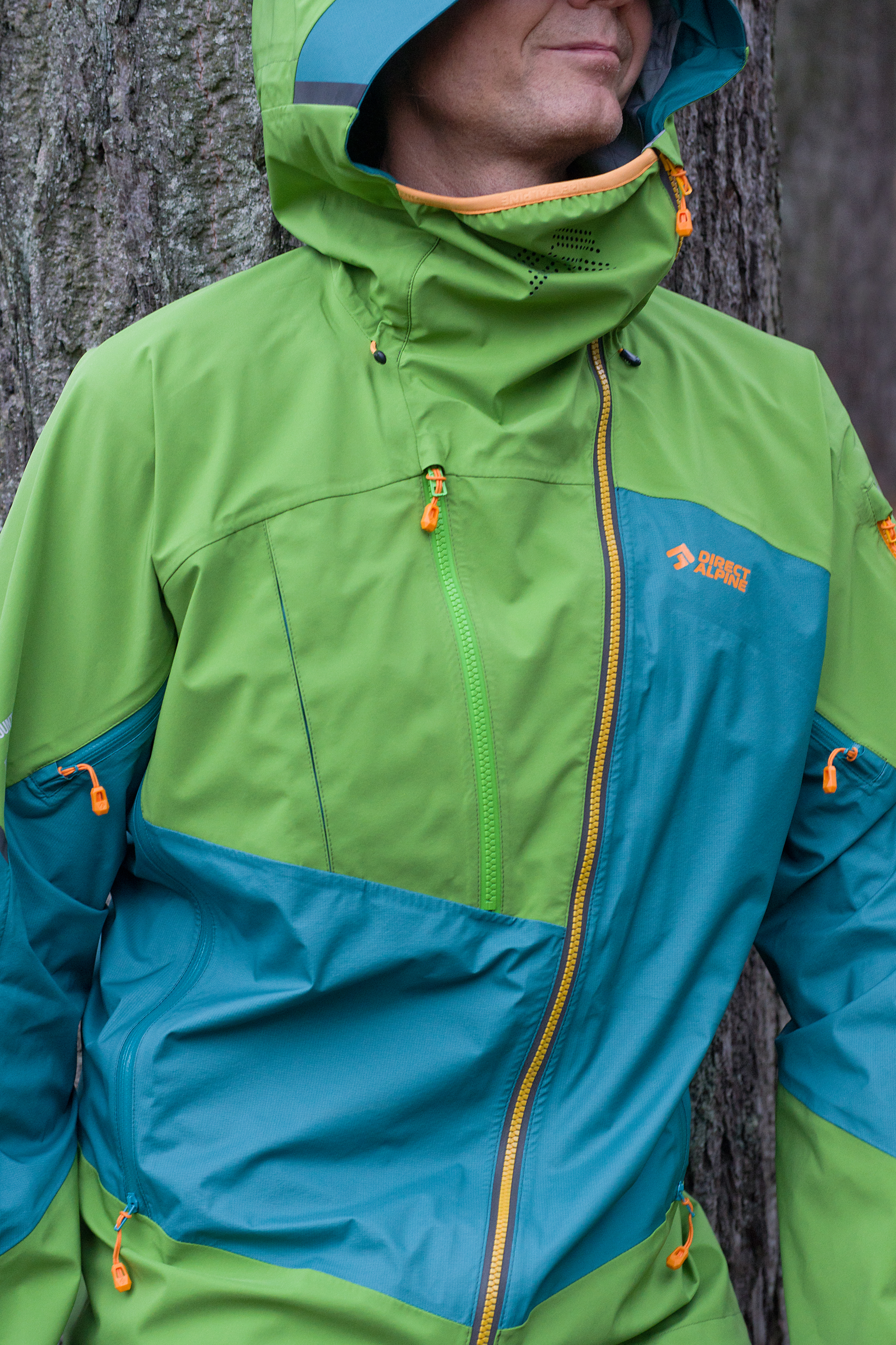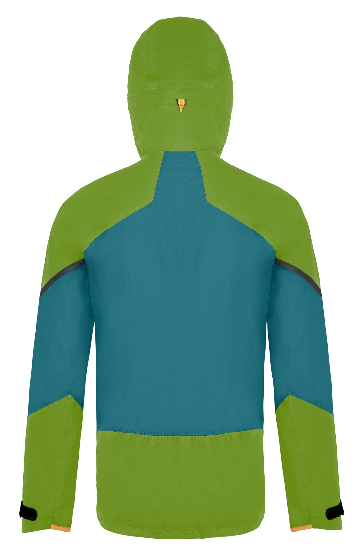 The outdoor jacket includes a large, well-designed hood with three-way adjustment, which can be pulled over a helmet. The hood also serves as a means to pack the jacket into your backpack. Long ventilation zippers on the sides are accessible even with backpack straps and are designed to allow access to inner layer pockets. By combining a sturdier fabric in high-stress areas (shoulders, sleeves, hood, and back) with a thinner fabric in less stressed areas, the jacket achieves an optimized balance of durability, extreme breathability, and weight.