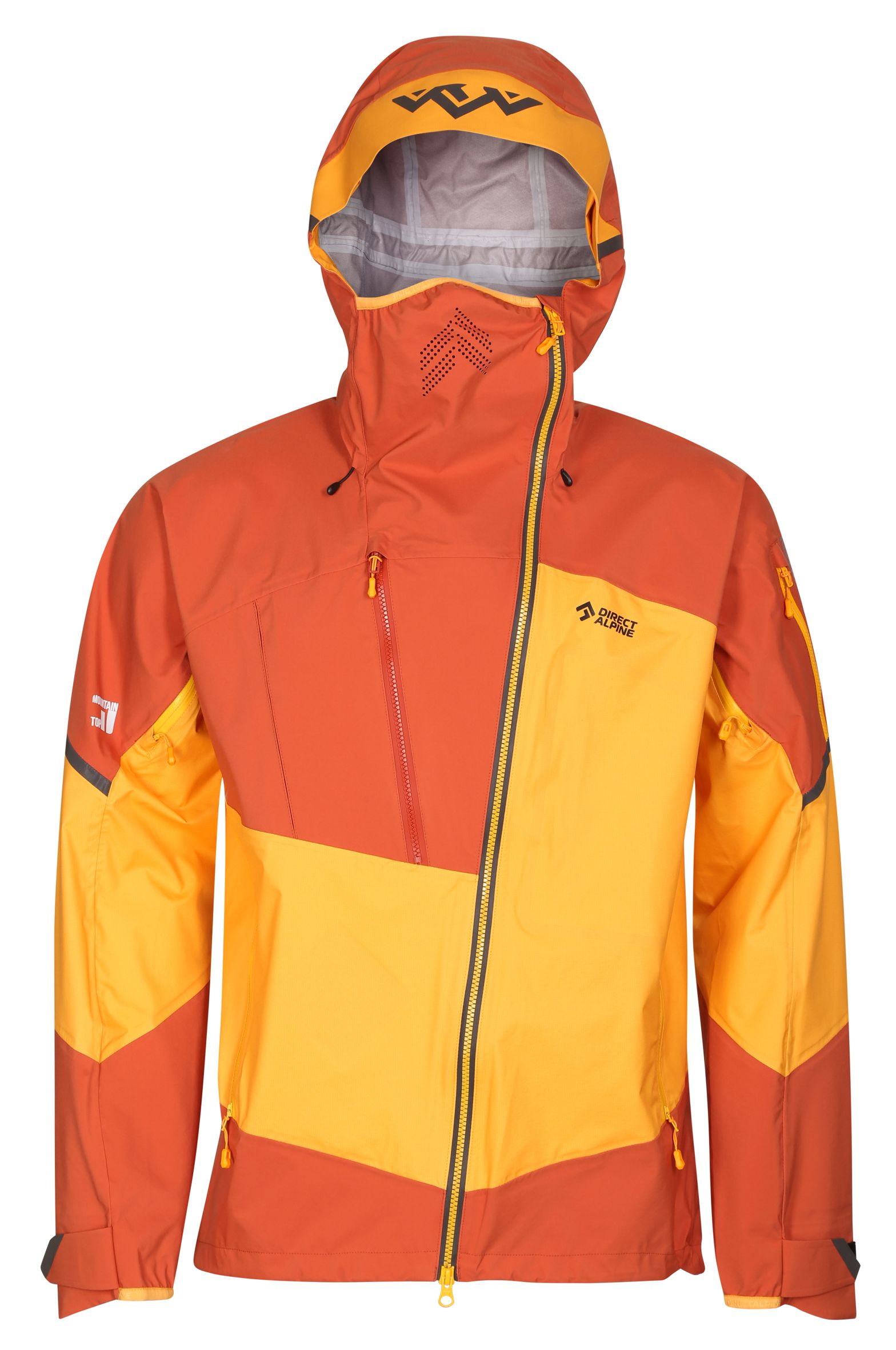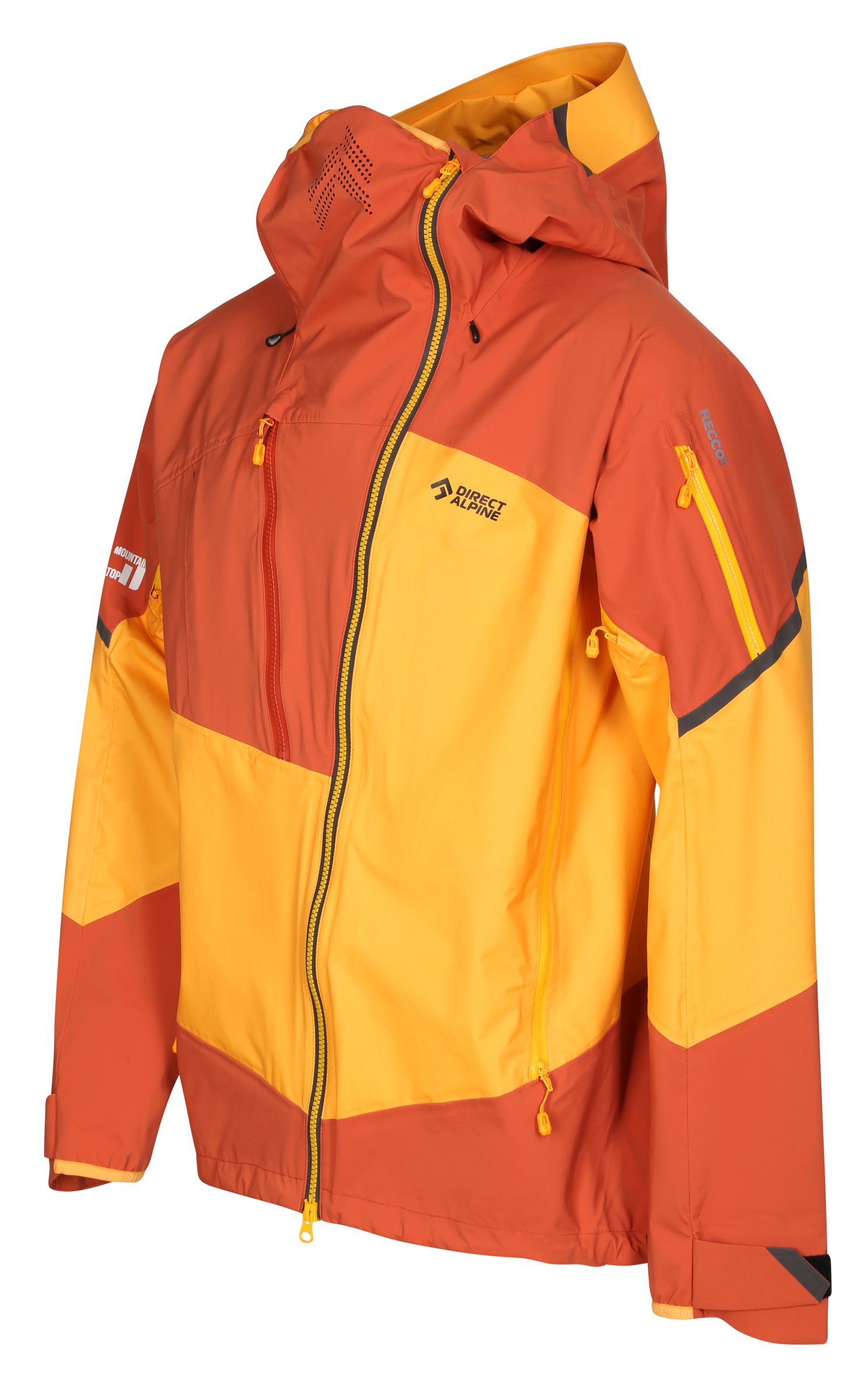The outdoor jacket includes a large, well-designed hood with three-way adjustment, which can be pulled over a helmet. The hood also serves as a means to pack the jacket into your backpack. Long ventilation zippers on the sides are accessible even with backpack straps and are designed to allow access to inner layer pockets. By combining a sturdier fabric in high-stress areas (shoulders, sleeves, hood, and back) with a thinner fabric in less stressed areas, the jacket achieves an optimized balance of durability, extreme breathability, and weight.